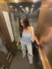 This elegant co-ord set features a sleeveless beige crop top with a front tie-up and black zigzag trim detailing, adding a touch of contrast and charm. The matching wide-leg pants mirror the trim at the hem, creating a cohesive and balanced look. Perfect for a stylish yet comfortable outfit, it effortlessly blends minimalism with chic accents.