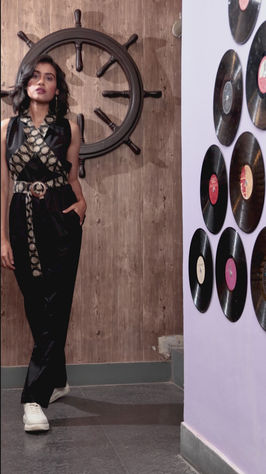 Black Waistcoat with Printed Lapel Belt & Black Pants