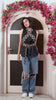 This black sleeveless top features a unique wrap design highlighted by a bold printed collar that crosses over the front and cinches at the waist with a statement belt. The structured silhouette and gold accents add a touch of drama, making it a standout piece for both casual and elevated looks.