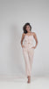 A stylish ensemble featuring a sleeveless waistcoat made from a pastel pink linen blend, with an adjustable halter neck, V-cut at neckline and hem, and secured with matching color buttons. Paired with high-waist trousers, featuring side pockets, pleated details, and a front zip fly with a top button fastening.