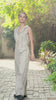 A chic beige textured waistcoat with a lapel collar, front button closure, and striking black piping, paired with high-waisted beige textured pants featuring black piping, a front button and zip closure, and drawstring hems for a versatile jogger-style twist.