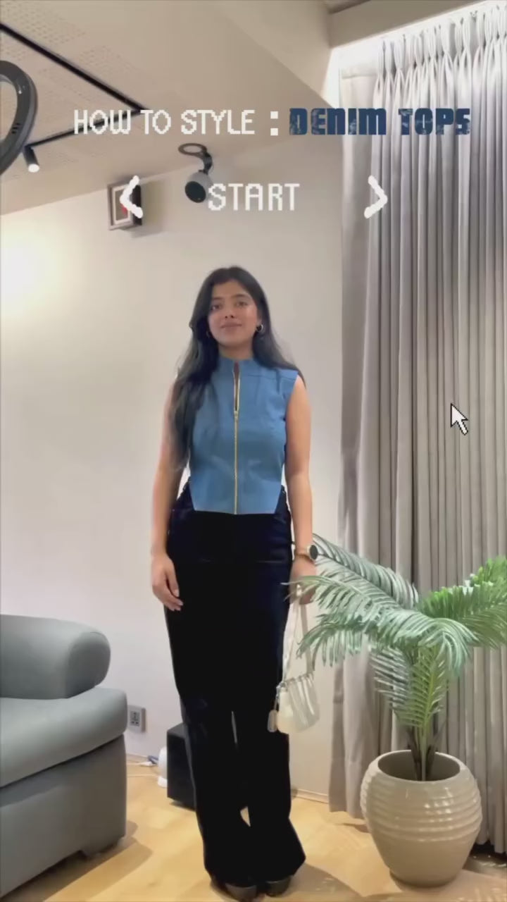 A denim crop top featuring two large flap pockets at the front and a zip fastening at the back.