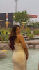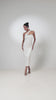 A corset-style midi tube dress made in a lycra Satin material with a pearl and stone-embellished neck strap.