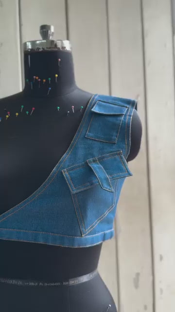 One-shoulder vest featuring flap pockets and a metal D-shaped adjustable fastening at the side waist.