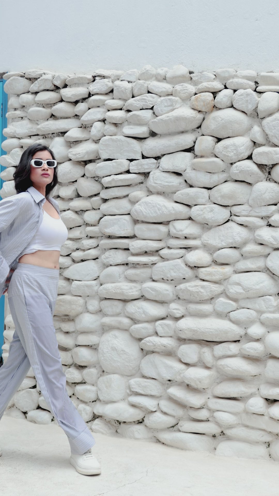 The shirt and pants contrast vertical and horizontal stripes for a fresh, edgy vibe.