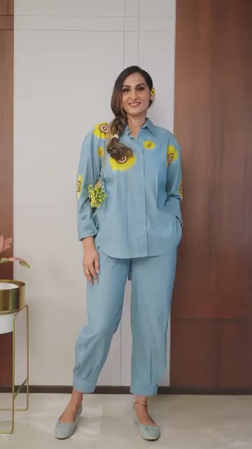 An oversized denim shirt adorned with intricate threadwork sunflower motifs, enhanced by a stylish high-low hemline for a touch of casual elegance paired up with High-waisted tapered pants crafted from premium denim, featuring a relaxed fit for effortless style and comfort.